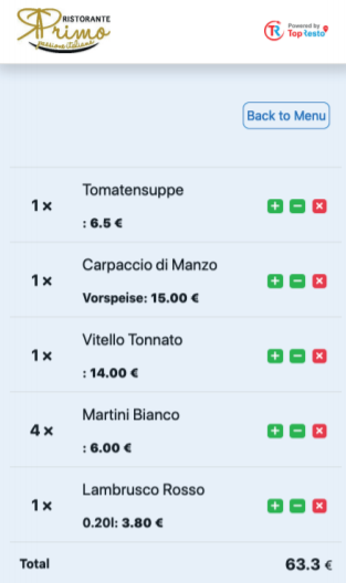 Ein einfacher Klick und Sie gelangen zum Essen, den Getränken oder zu der Weinkarte.